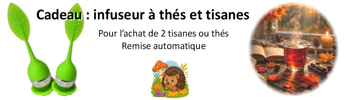 OFFRE DU MOMENT : Pour l'achat de 2 tisanes ou thés achetés, la 3ème est à -50%. Retrouverez les dans la catégorie THES ET TISANES (remise automatique).